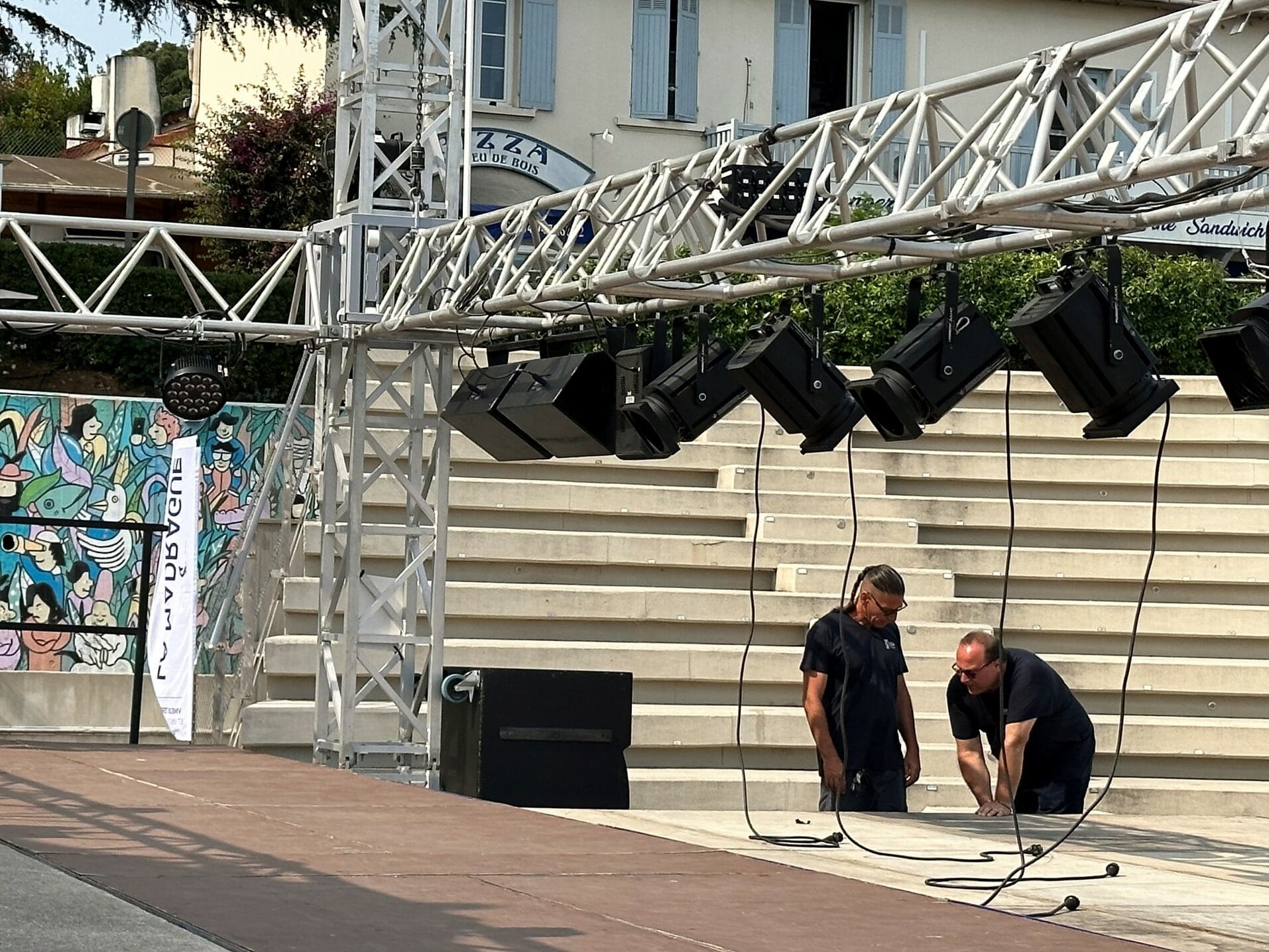 Dans le cadre du Festival des Anches d’Azur, toutes les équipes sont mobilisées pour assurer le bon déroulement de la manifestation. Des équipements de qualité sont mis à disposition : tables de mixage, poursuite, amplificateurs…
